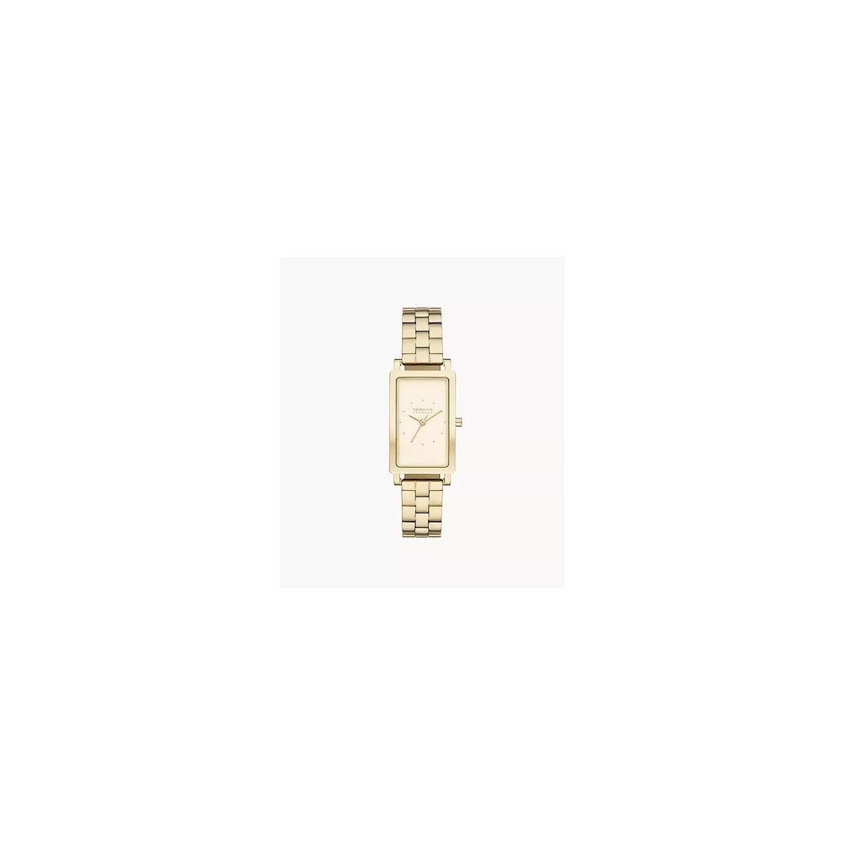 Cette montre Hagen Lille est dotée d'un boîtier rectangulaire de 43 x 22 mm avec un cadran sablé champagne, un mouvement à trois aiguilles et un bracelet en acier inoxydable or jaune. Le bracelet de la montre est interchangeable.