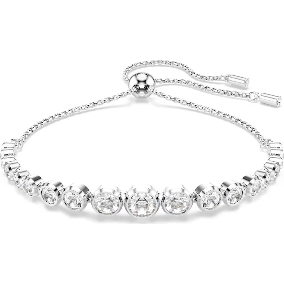 Conçu pour une élégance au quotidien, ce bracelet en métal rhodié exprime la simplicité de la famille Imber. Ce design présente un dégradé de cristaux incolores de taille ronde, chacun serti chaton moderne sur une chaîne souple, avec un fermoir coulissant pour plus de confort. Chaque goutte délicate apporte une sophistication éclatante à votre poignet, vous offrant un bijou incontournable qui peut s'accumuler malicieusement à d'autres modèles.