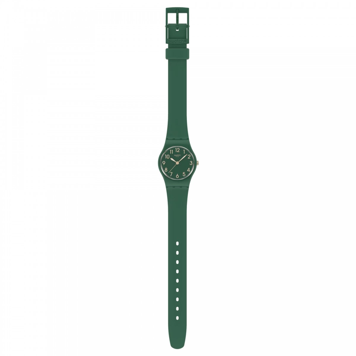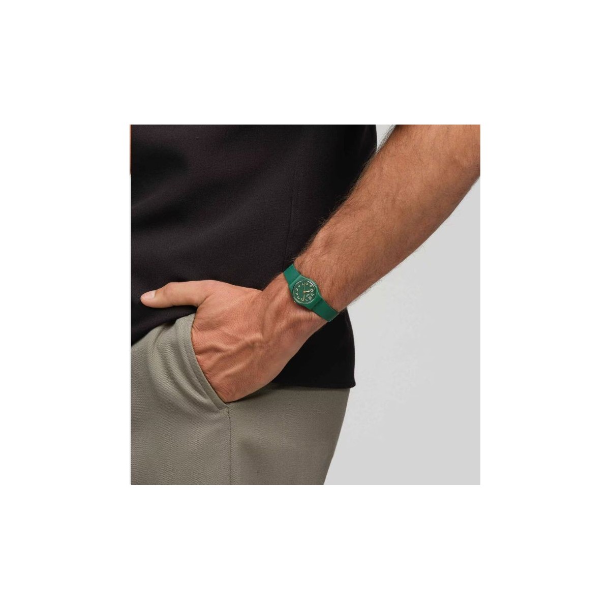 Cette montre possède un cadran vert foncé avec des chiffres imprimés en beige, des aiguilles des heures et des minutes couleur or rose à effet glow-in-the-dark et une aiguille des secondes couleur or rose. Le boîtier est vert foncé mat. Le tout est complété par un bracelet biosourcé vert foncé mat avec une boucle et un passant assortis.