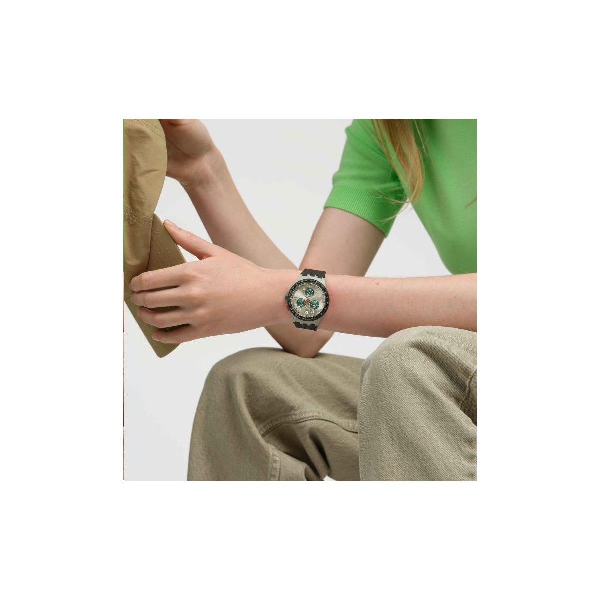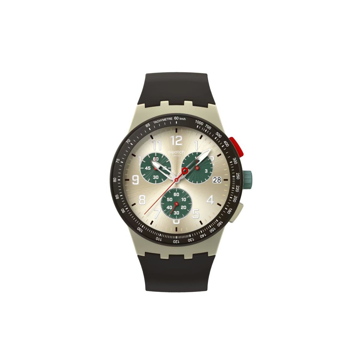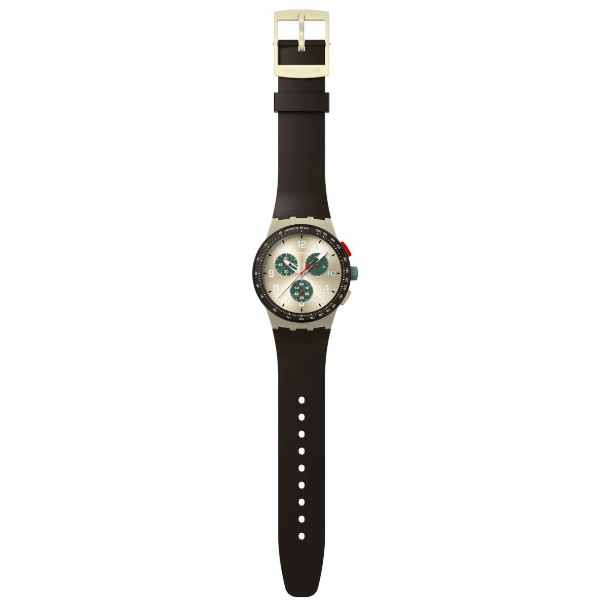 Ce chronographe possède un cadran argenté brossé soleil avec des sous-cadrans vert foncé, des aiguilles des heures et des minutes argentées à effet glow-in-the-dark, une aiguille des secondes ainsi que des sous-cadrans rouges et une fenêtre de date à 3 heures. Le boîtier beige mat est doté d'une lunette marron foncé mat avec une échelle tachymétrique imprimée en blanc, d'une couronne et de poussoirs multicolores. Il est complété par un bracelet marron foncé mat doté d'un passant assorti et d'une boucle beige mat.