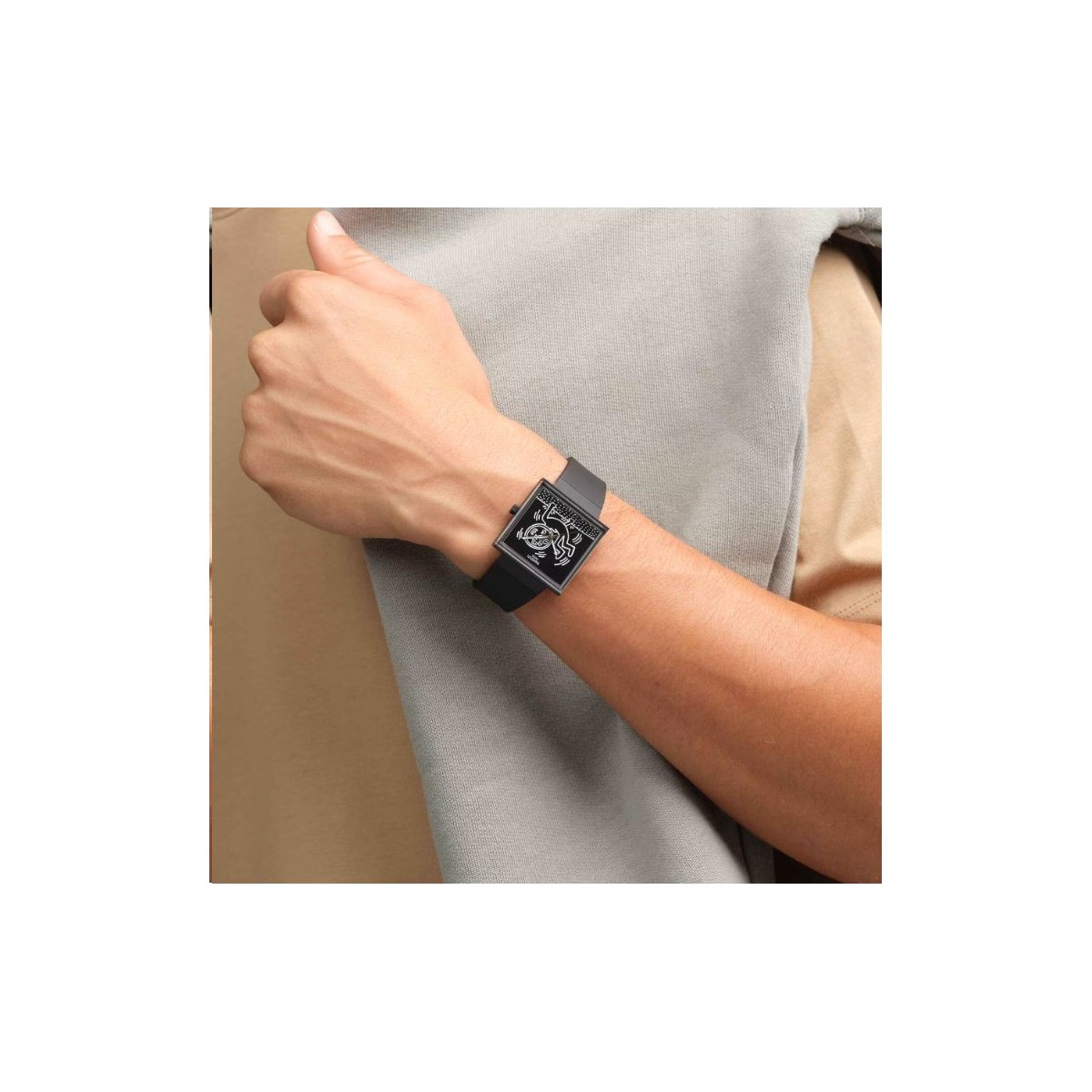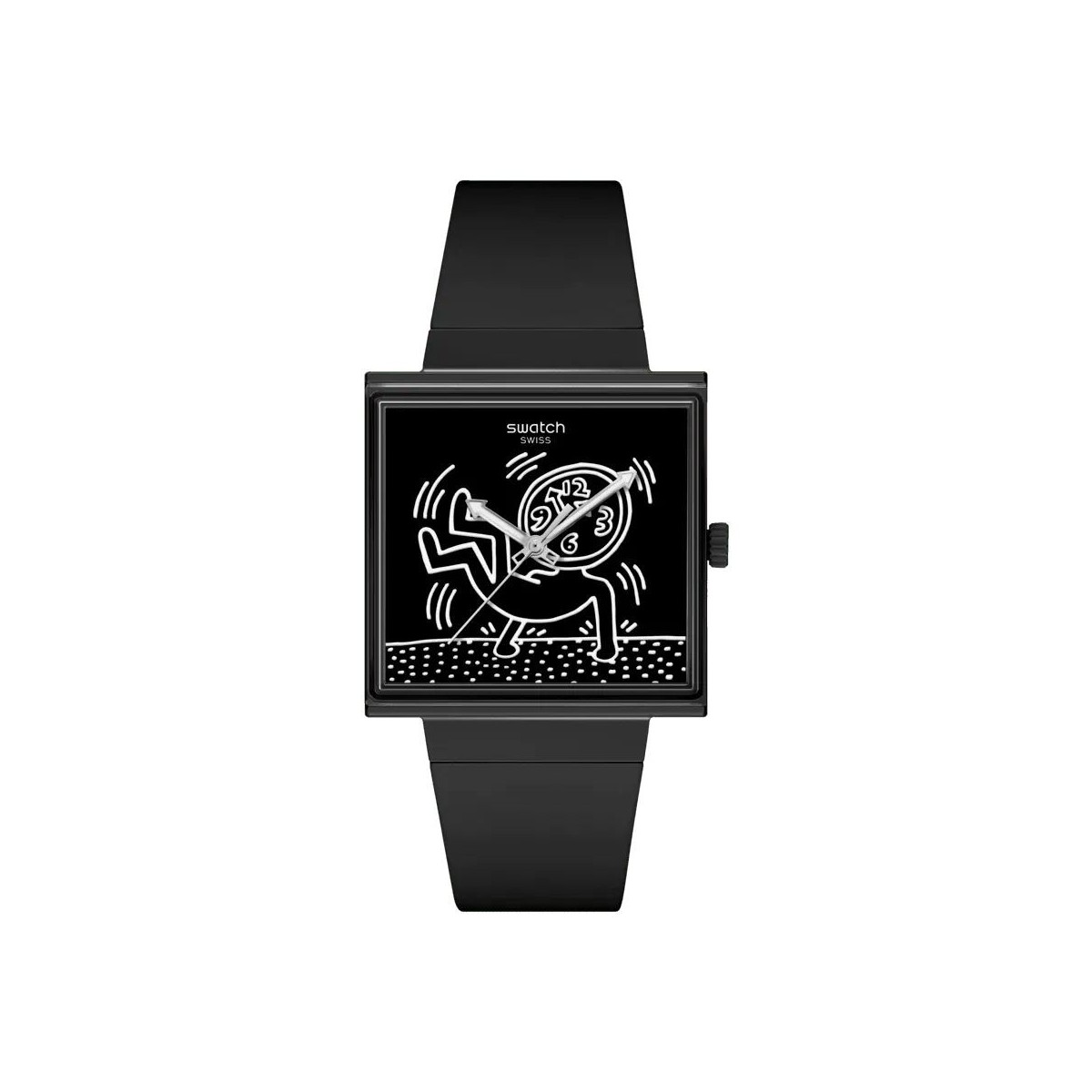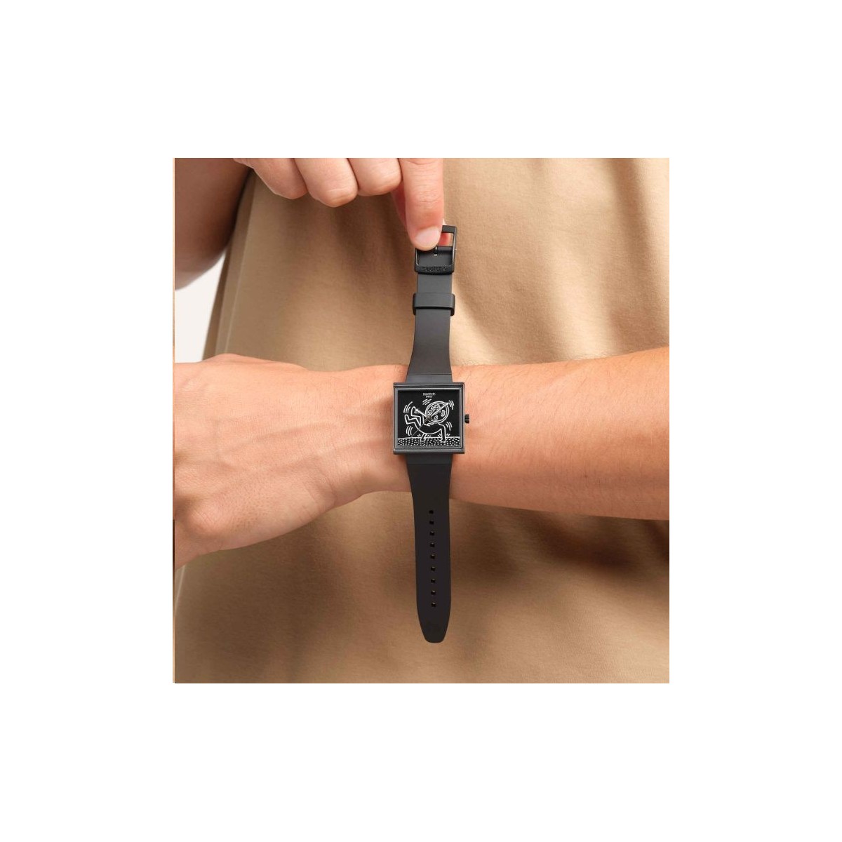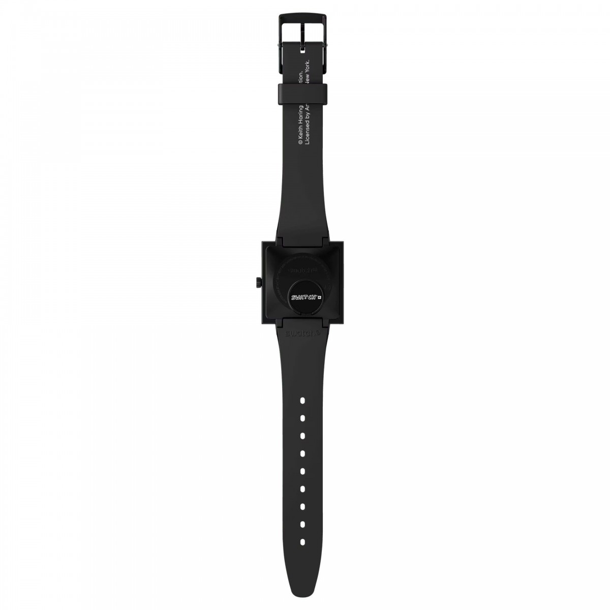 Le boîtier carré en biocéramique noir mat de cette montre possède un verre biosourcé bord-à-bord qui offre une vue latérale sur le cadran noir à motif blanc. Ce dernier accueille une aiguille des heures et des minutes argentée en forme de flèche qui brille dans l'obscurité ainsi qu'une aiguille des secondes argentée, elle aussi. Pour compléter ce look noir mat, le bracelet intégré biosourcé s'accompagne d'un passant biosourcé et d'une boucle en biocéramique assortis. Au dos, un logo Swatch dessiné par Keith Haring décore le couvercle de la pile noir mat à motif blanc.