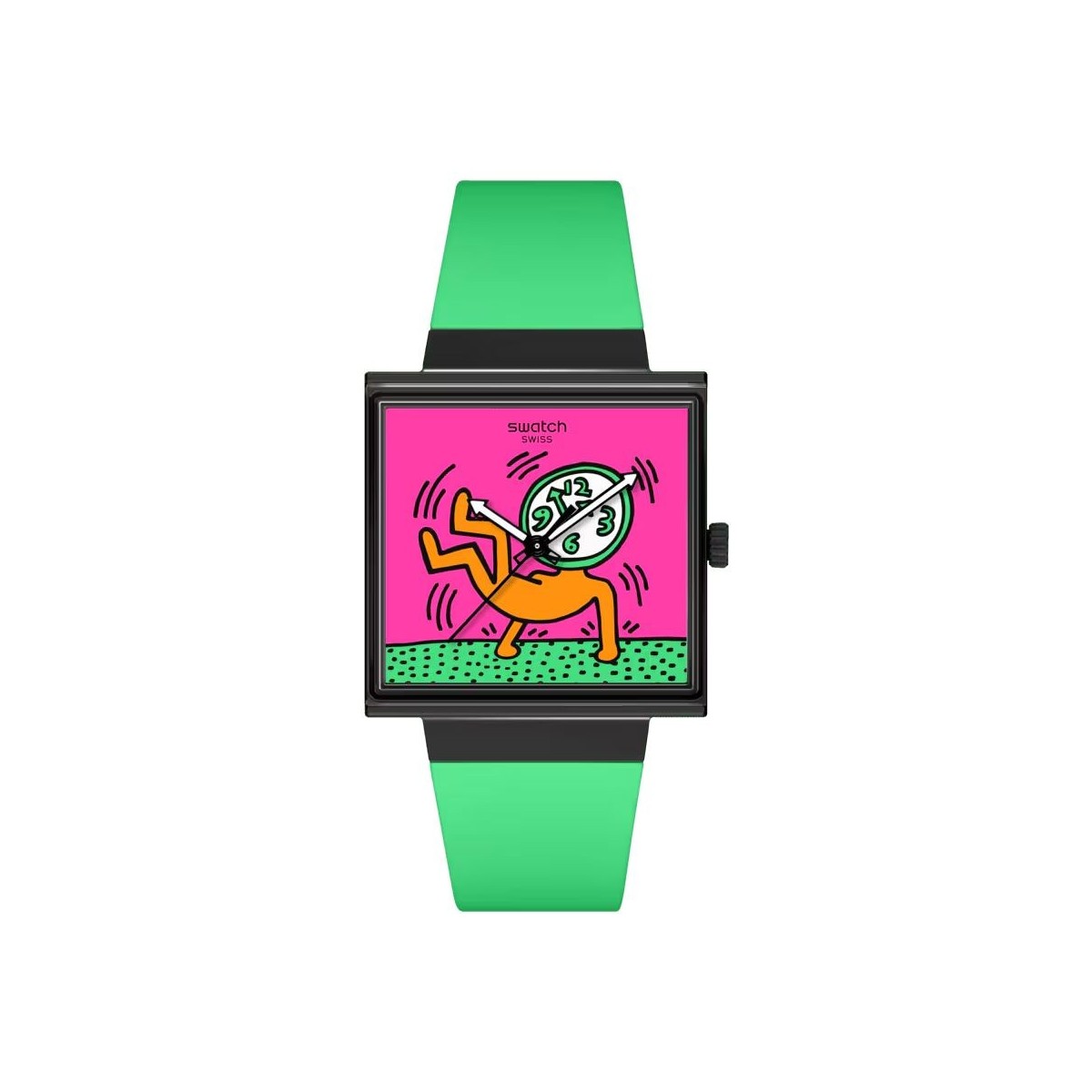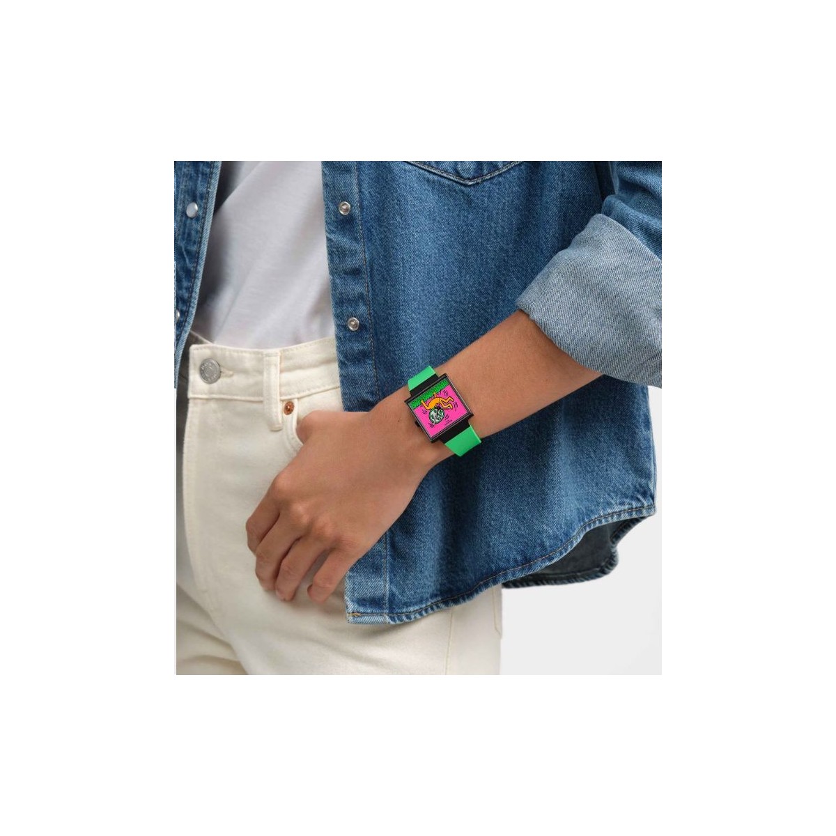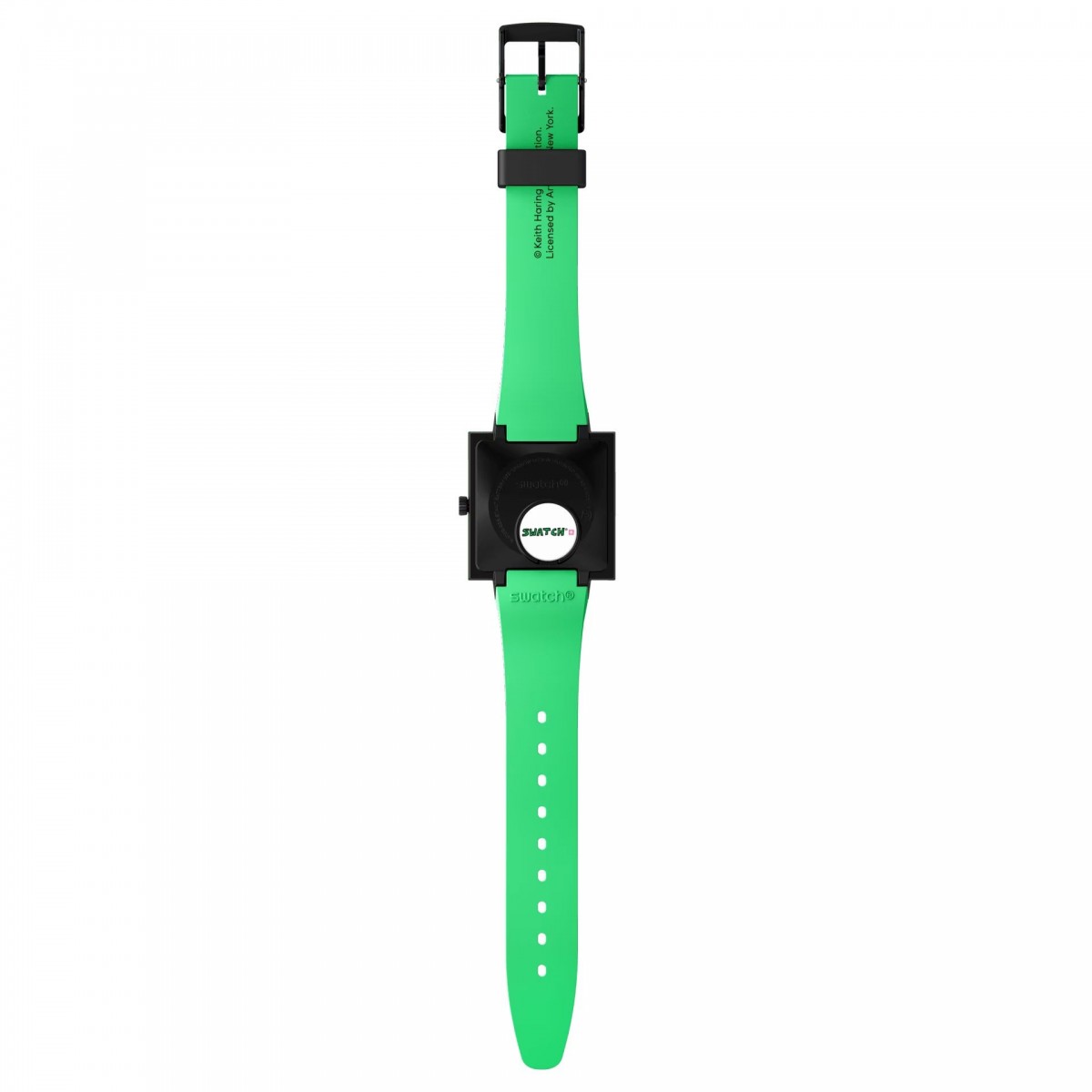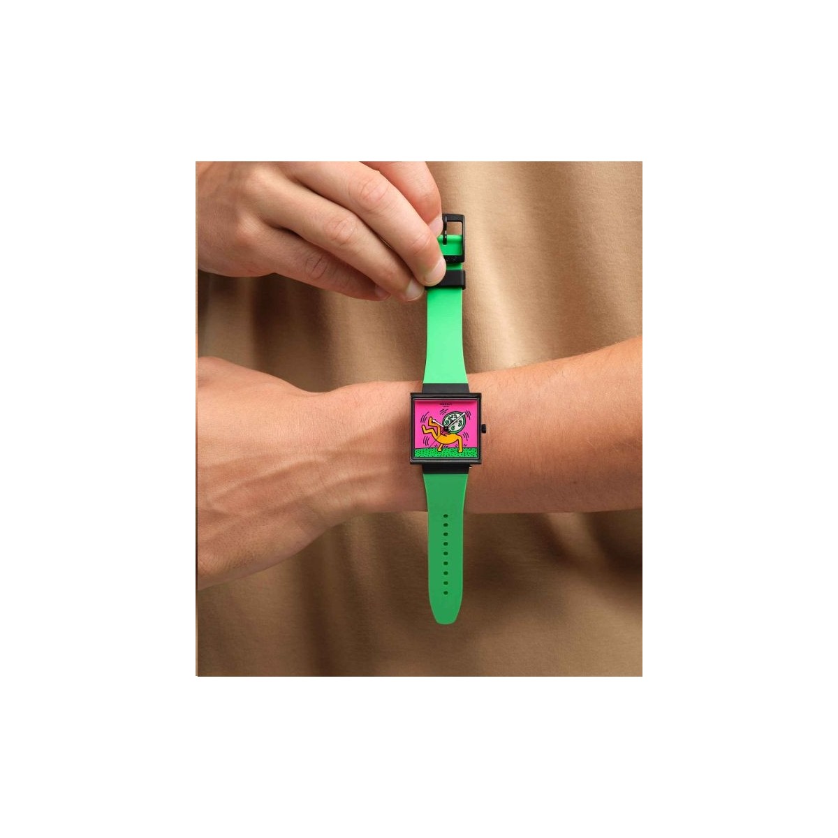 Le boîtier carré en biocéramique noir mat de cette montre possède un verre biosourcé bord-à-bord qui offre une vue latérale sur le motif multicolore du cadran. Ce dernier accueille une aiguille des heures et des minutes noire en forme de flèche qui brille dans l'obscurité ainsi qu'une aiguille des secondes noire, elle aussi. Pour compléter ce look mat, le bracelet intégré biosourcé vert clair s'accompagne d'un passant noir biosourcé et d'une boucle en biocéramique assortie. Au dos, un logo Swatch dessiné par Keith Haring décore le couvercle de la pile blanc mat à motif multicolore.