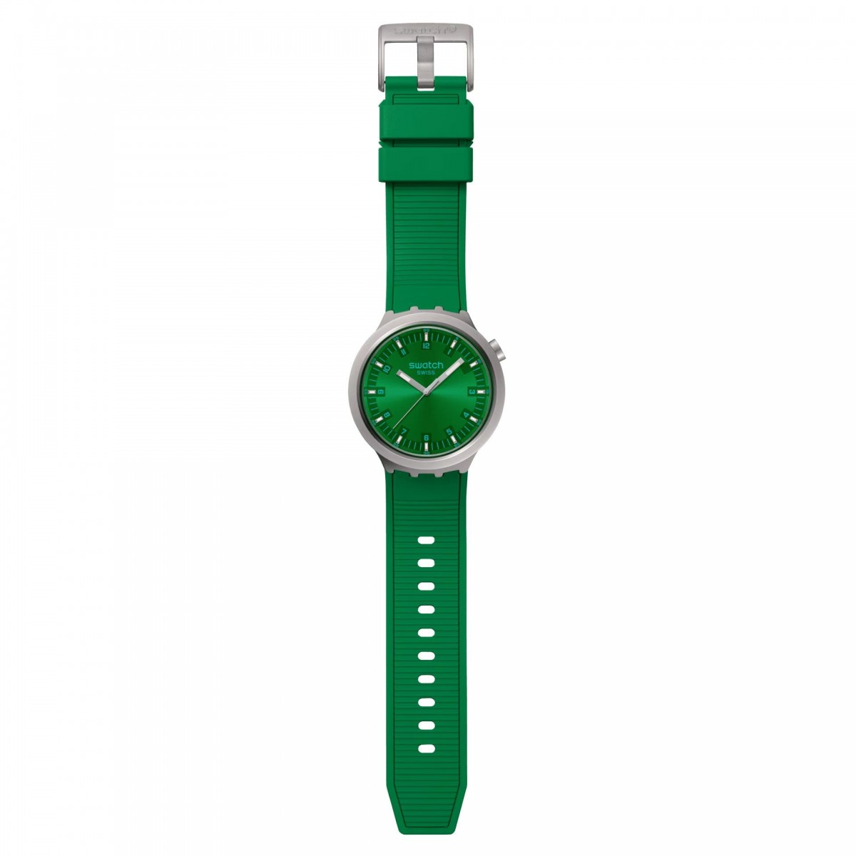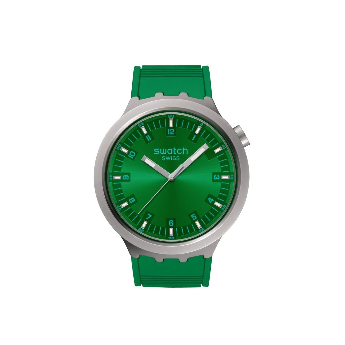 Cette montre oversize arbore un cadran vert foncé brossé soleil avec des index glow-in-the-dark, des chiffres et index imprimés turquoise, des aiguilles des heures et des minutes glow-in-the-dark et une aiguille des secondes argentée. Le boîtier et la lunette en acier inoxydable sablé contrastent avec le bracelet vert foncé aux passants assortis et une boucle en acier inoxydable sablé.