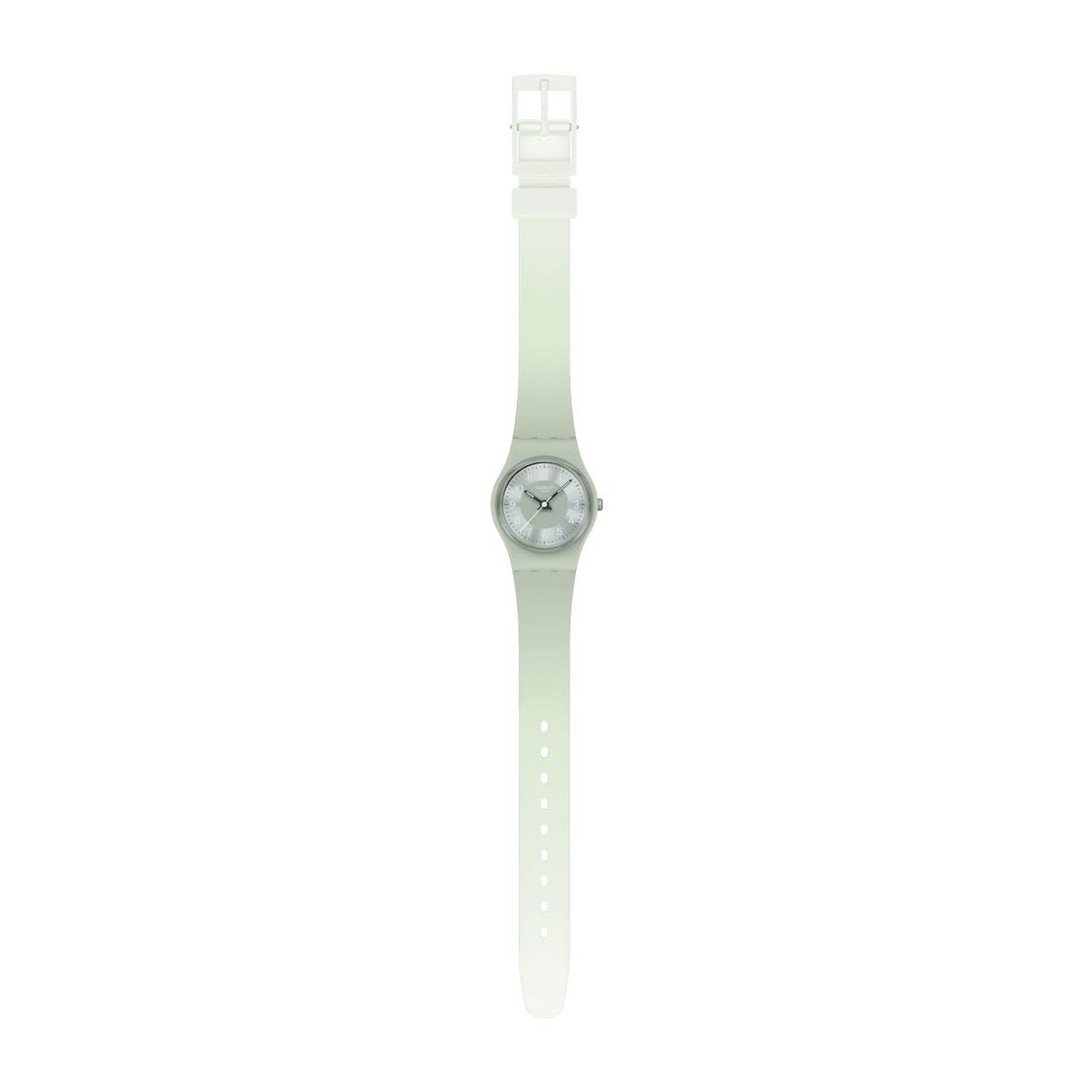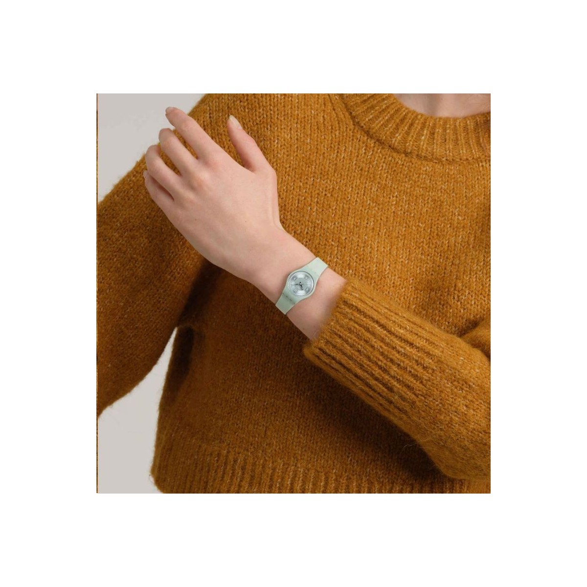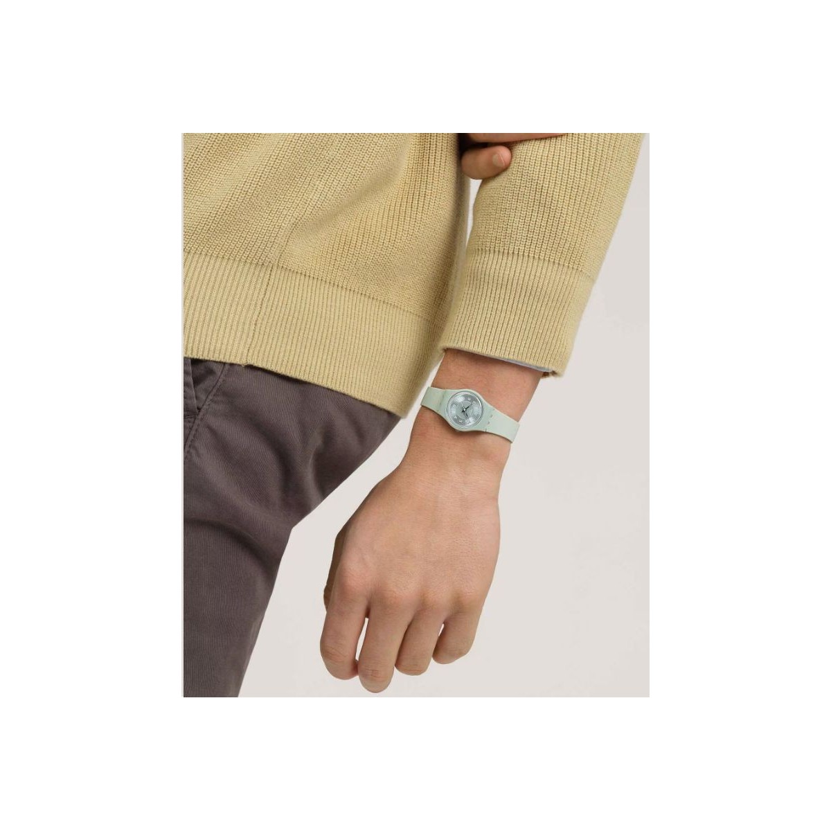 Cette petite montre possède un cadran brossé soleil vert clair décoré d'un rond vert au centre, de chiffres blancs et d'une minuterie noire _ tous imprimés. Les aiguilles des heures et des minutes noires qui brillent dans l'obscurité et l'aiguille des secondes blanche donnent l'heure. Le boîtier vert mat s'associe à un bracelet mat dégradé vert et vert clair, avec une boucle et un passant mats vert clair.
