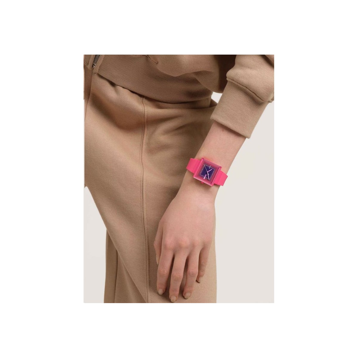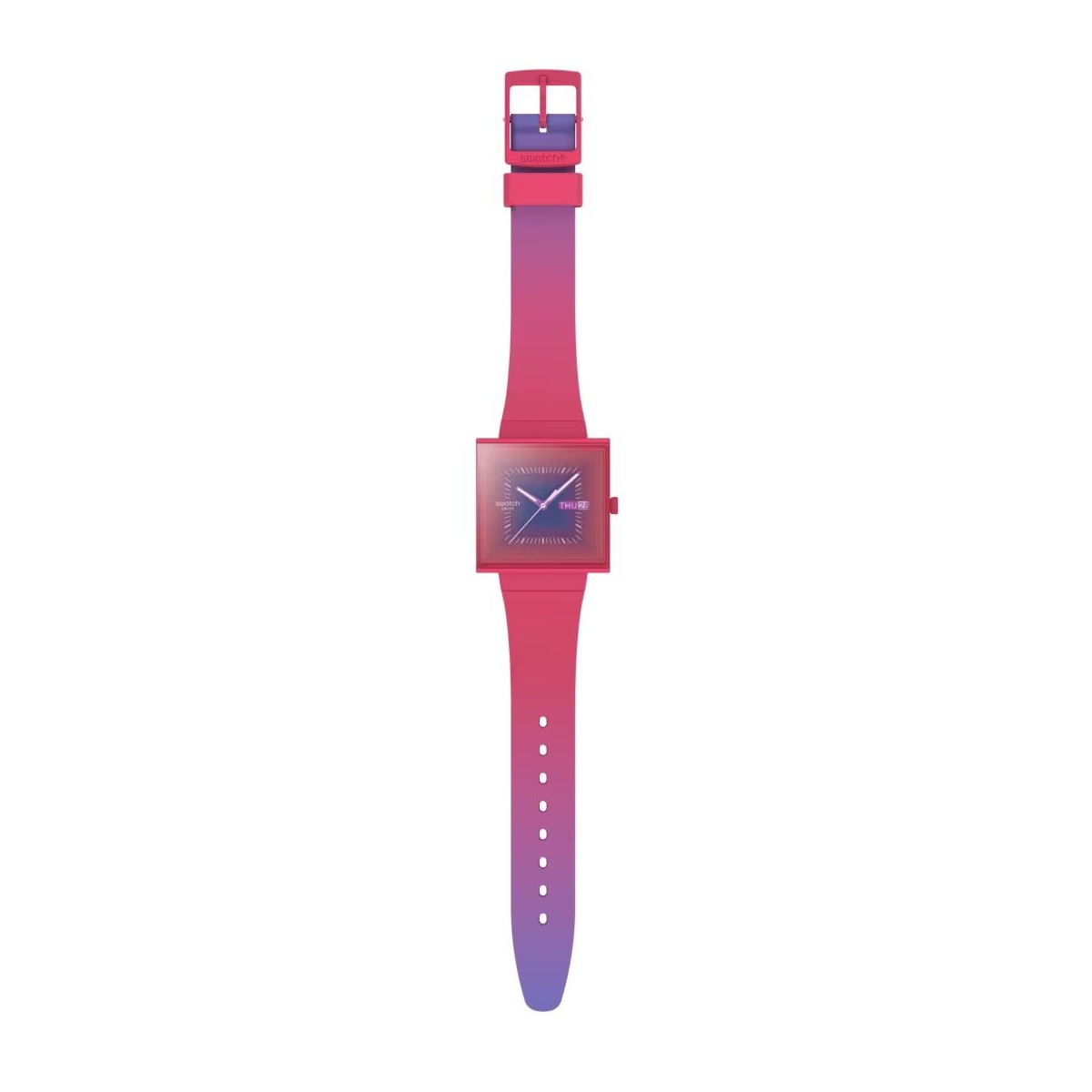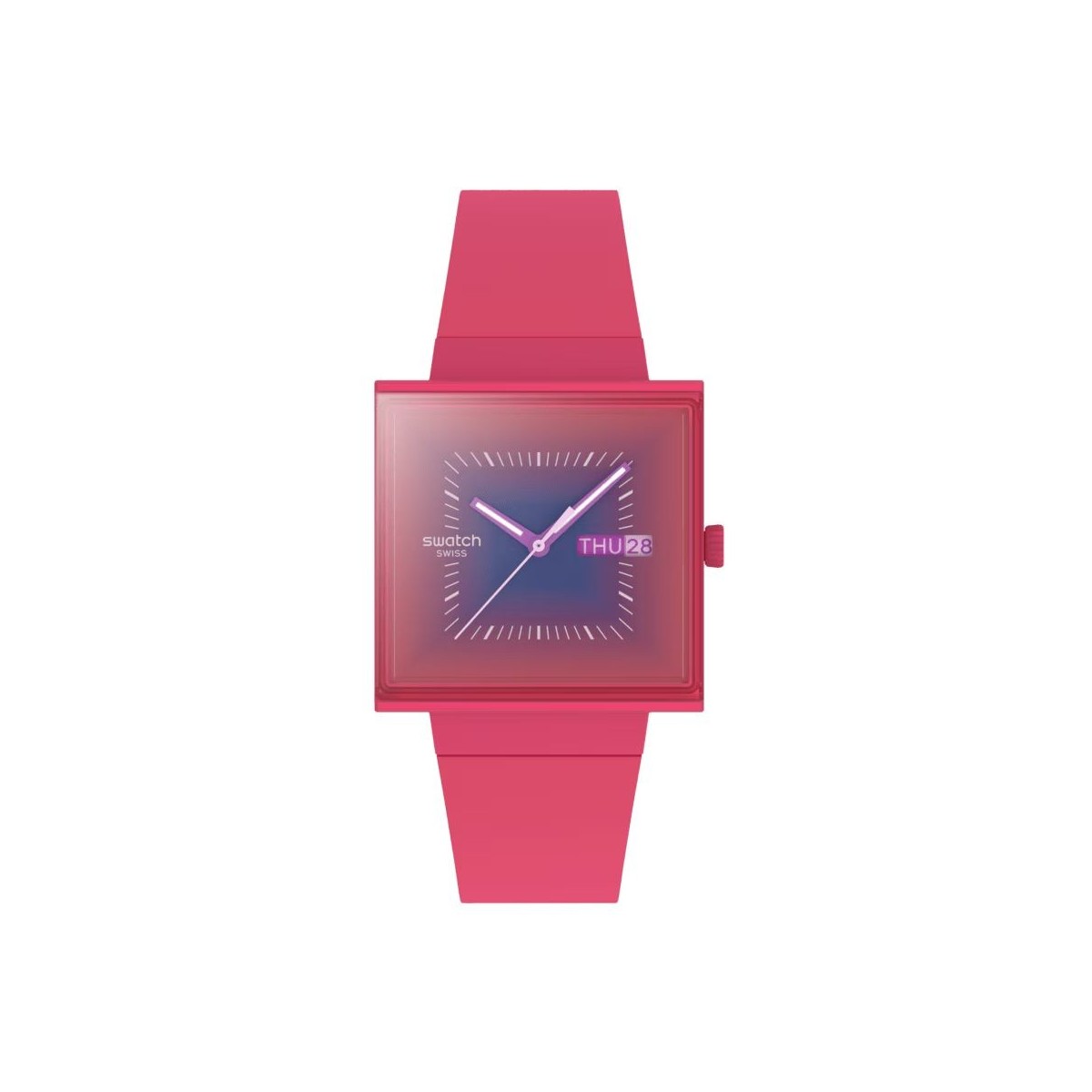 Le boîtier carré en biocéramique mate rose foncé de cette montre possède un verre biosourcé bord-à-bord qui offre une vue latérale sur la minuterie rose clair imprimée. Le cadran carré dégradé violet foncé et rose foncé accueille des aiguilles des heures et des minutes violettes qui brillent dans le noir, une aiguille des secondes rose clair et un guichet date rose foncé et rose clair à 3 heures. Le cadran et le boîtier s'associent à un bracelet mat dégradé rose foncé et violet, avec une boucle et un passant mats rose foncé.