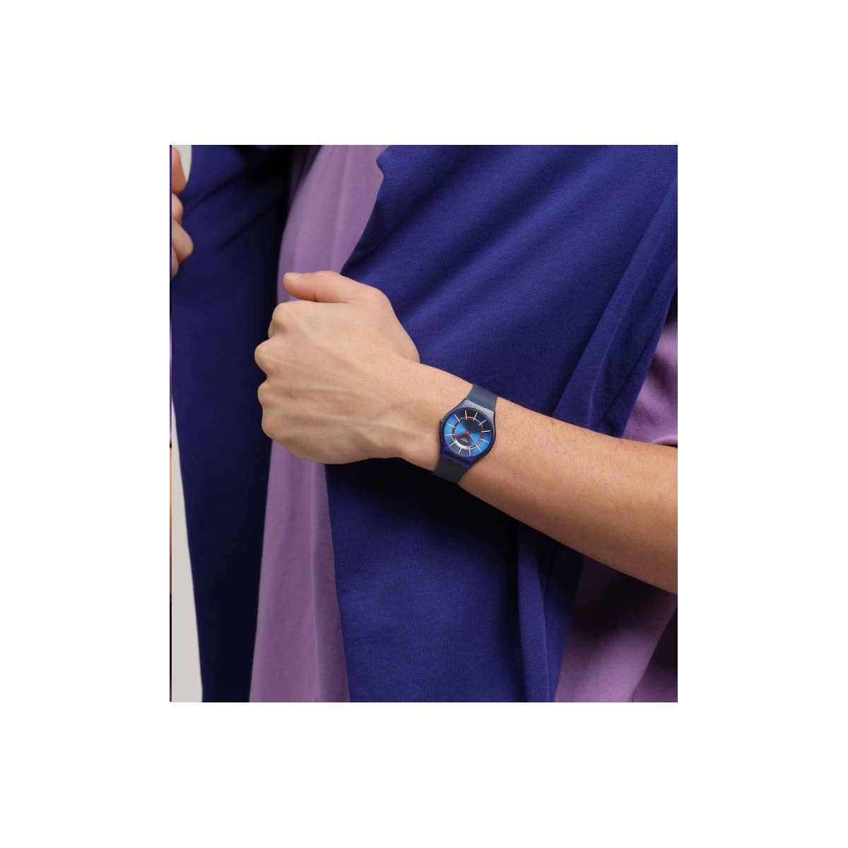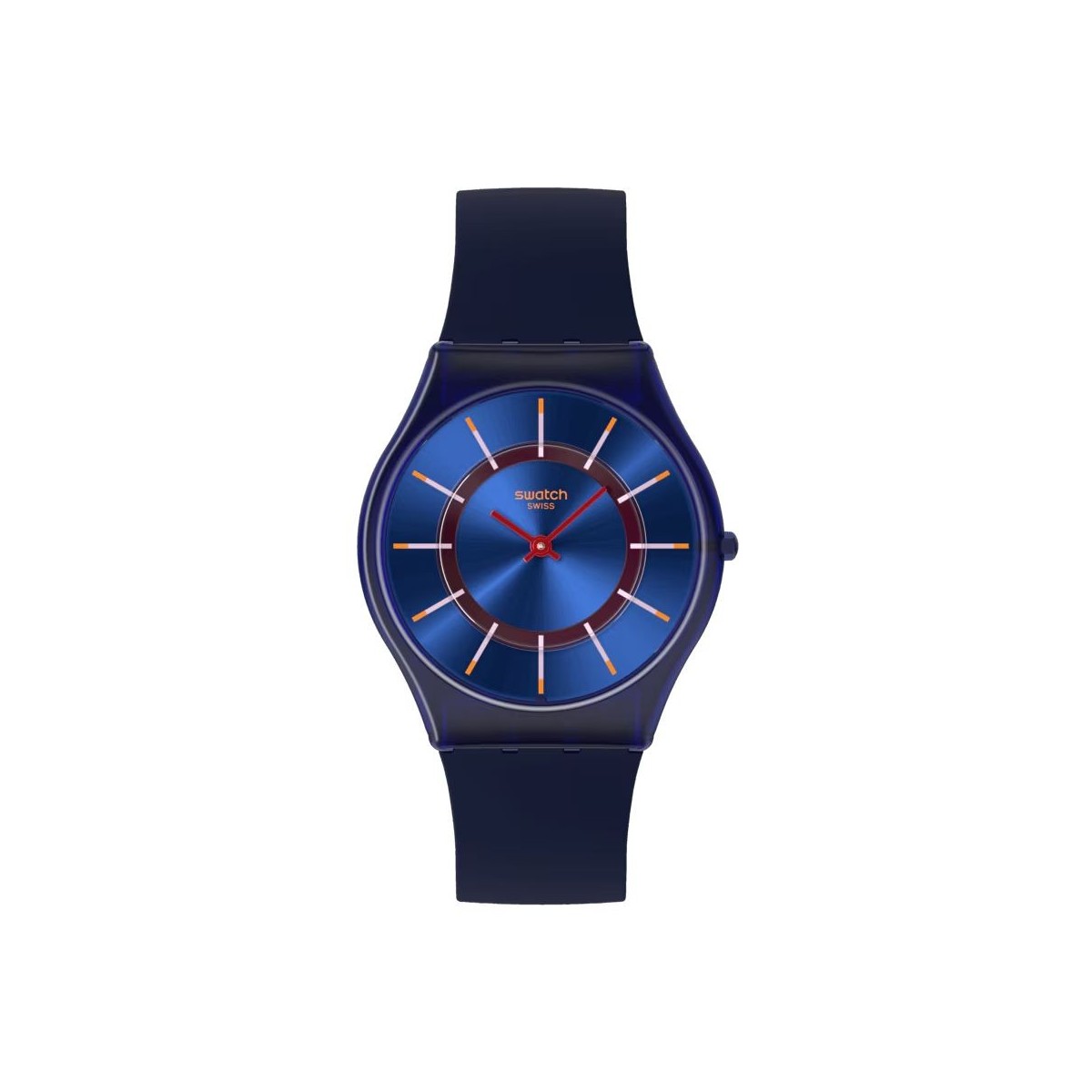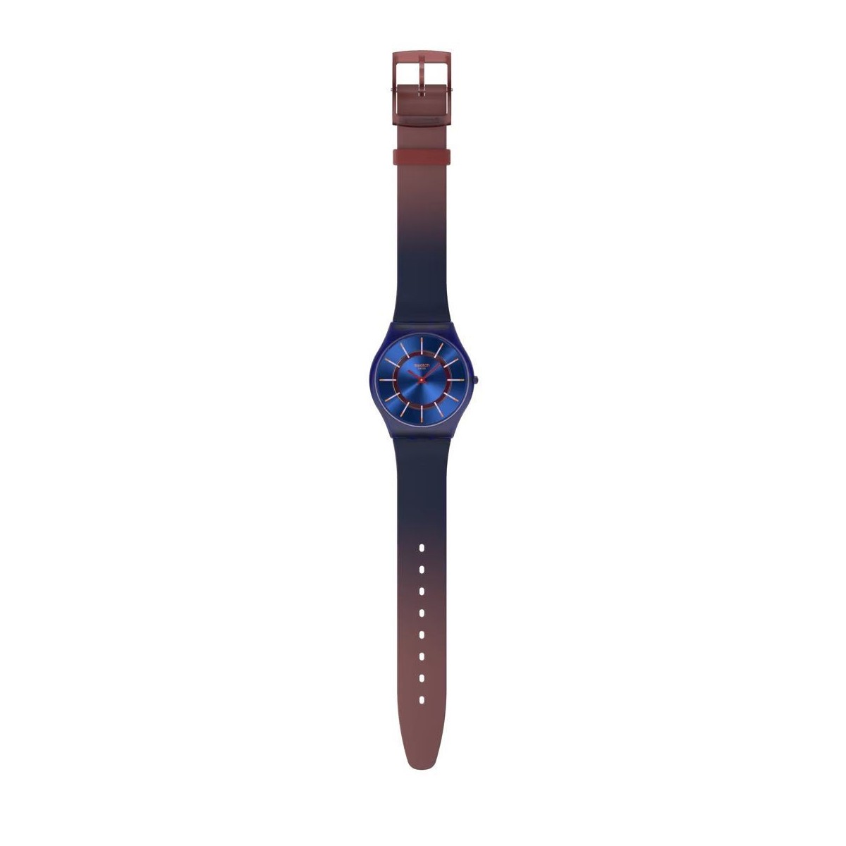 Cette montre ultrafine possède un cadran brossé soleil bleu foncé avec un anneau imprimé rouge foncé, des index bicolores violet clair et orange et des aiguilles des heures et des minutes rouges _ le tout sous un verre biosourcé. Le boîtier mat transparent bleu foncé s'associe à un bracelet mat dégradé bleu foncé et rouge foncé, avec une boucle et un passant mats transparents rouge foncé.