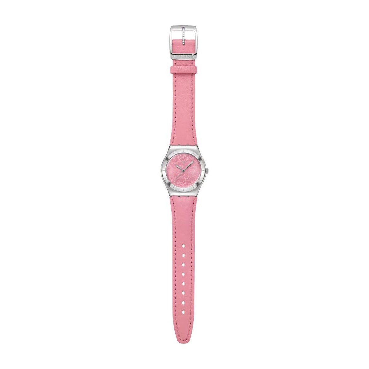 Cette élégante montre en acier inoxydable possède un cadran brossé soleil rose au motif fleuri blanc, des aiguilles des heures et des minutes argentées qui brillent dans le noir et une aiguille des secondes argentée. Le boîtier en acier inoxydable poli est assorti d'une lunette coordonnée avec des index gravés. Un bracelet en cuir rose avec des surpiqûres assorties, accompagné d'un passant en cuir rose et d'une boucle en acier inoxydable poli, complète l'ensemble.