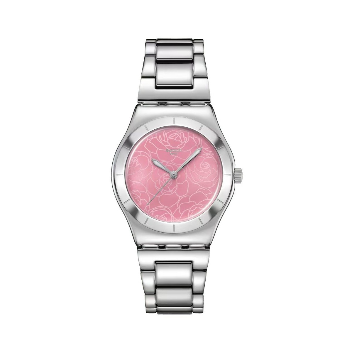Cette élégante montre en acier inoxydable possède un cadran brossé soleil rose au motif fleuri blanc, des aiguilles des heures et des minutes argentées qui brillent dans le noir et une aiguille des secondes argentée. Le boîtier en acier inoxydable poli est assorti d'une lunette coordonnée avec des index gravés. Un bracelet en acier inoxydable poli fermé d'une boucle papillon complète l'ensemble.