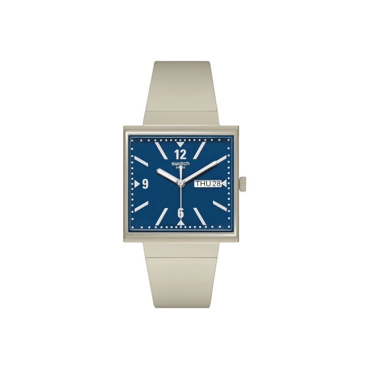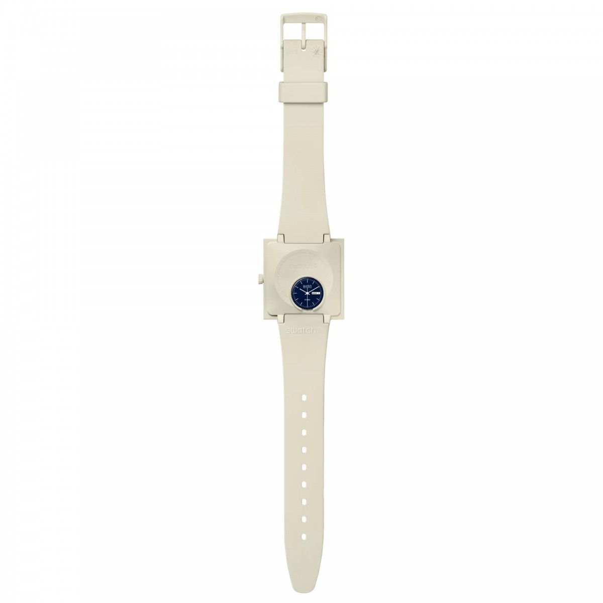Son boîtier carré en BIOCERAMIC arbore un verre bord à bord biosourcé qui offre une vue latérale sur les index et les chiffres de la montre. Le cadran carré est doté d'aiguilles glow-in-the-dark et d'un affichage du jour de la semaine et de la date à 3 heures. Un bracelet biosourcé intégré complète l'ensemble. Au dos, un couvre-pile imprimé représente un des cadrans dont est inspirée cette montre beige carrée dotée d'un cadran bleu.