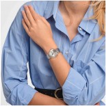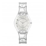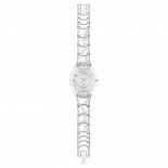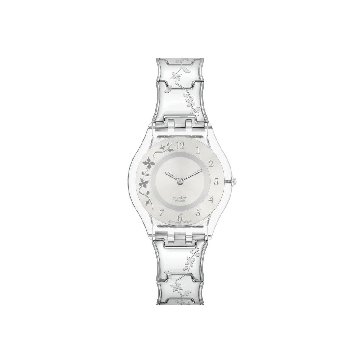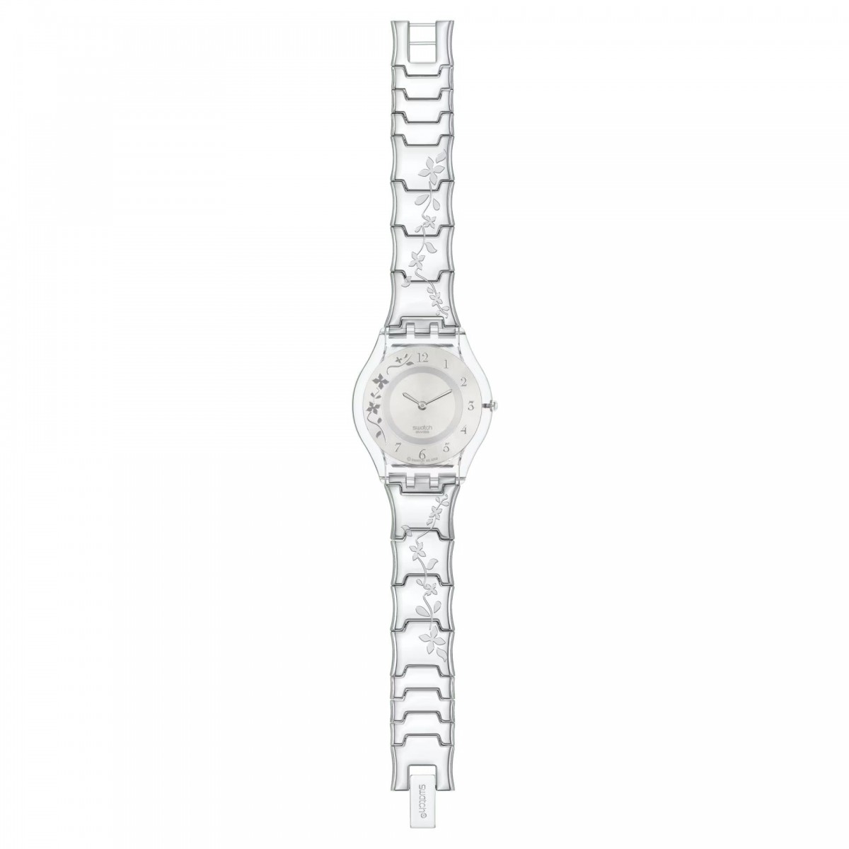 Un charmant motif floral en acier sur acier. Une fleur gravée en acier grimpe à travers les élégants maillons arqués en acier du bracelet. Cette Skin raffinée et délicatement dessinée a un boîtier en plastique transparent et un cadran argenté brossé soleil sur lequel un motif en applique de fleur argentée complète les chiffres arabes argentés et polis aux heures 1 à 7 et 12. Délicates aiguilles des heures et des minutes aux extrémités rondes.