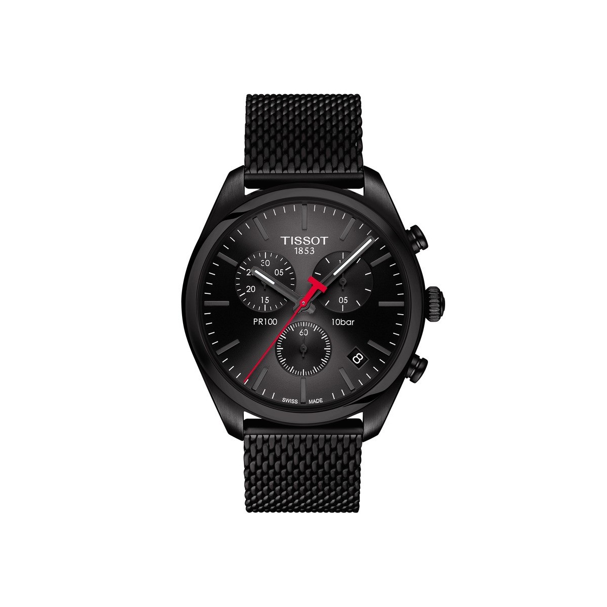 La Tissot PR 100 Chronograph a été remise au goût du jour tout en conservant les caractéristiques emblématiques qui ont fait son succès ces dernières décennies : précision, robustesse et étanchéité jusqu'à une pression de 10 bar (100 m). Elle possède un boitier noir, monté sur un bracelet en maille milanaise en acier avec un revêtement PVD noir qui lui donne un caractère unique.