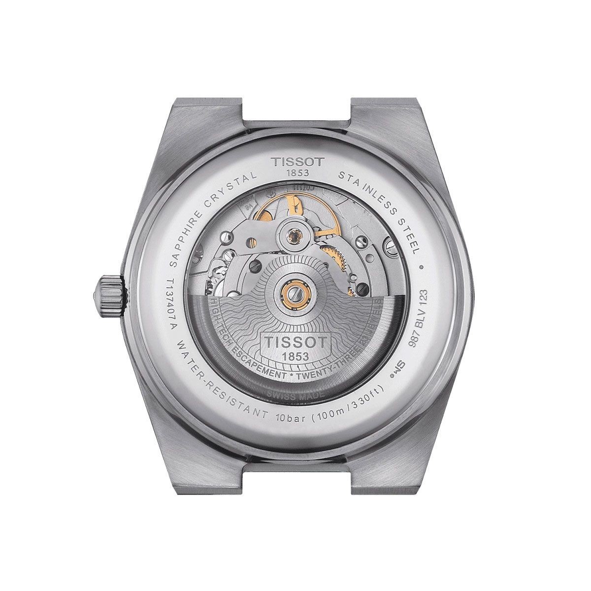 Le boîtier en acier inoxydable 316L de la Tissot PRX 40 205 a un diamètre de 40 mm. Il a une forme légèrement tonneau et est orné d'une lunette étroite et ronde. Sur les côtés, des finitions arrondies brossées verticalement alternent avec des facettes polies.