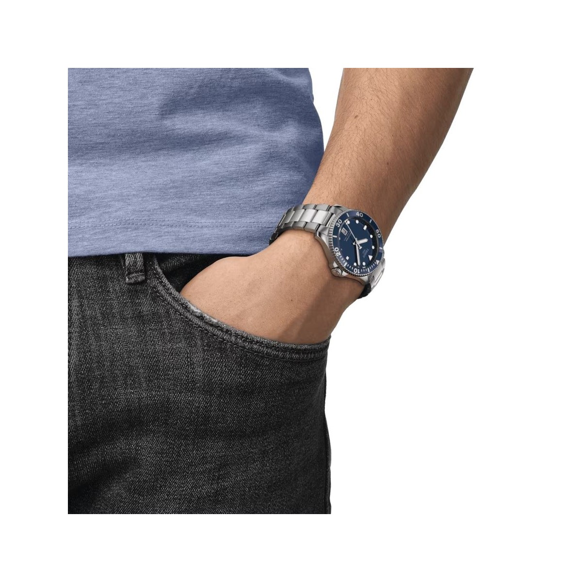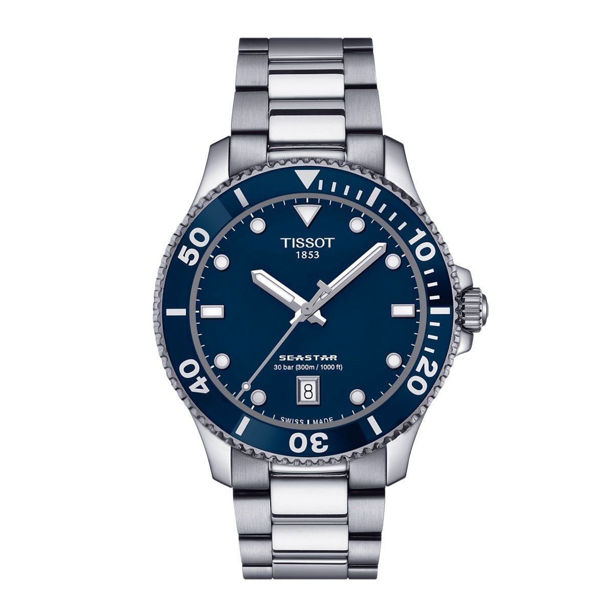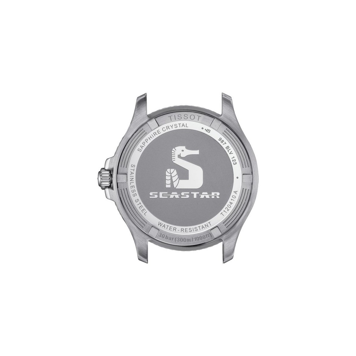 La montre Tissot Seastar 1000 Quartz 40 mm offre un look sportif et des fonctionnalités indispensables sous l'eau. Parfaitement fiable jusqu'à une pression de 30 bar (300m), elle est la preuve qu'une montre de sport sous-marin et un garde-temps sophistiqué peuvent être conciliés en un même objet. Cette montre est idéale de jour comme de nuit. La lisibilité en basse lumière est assurée grâce au Super-LumiNova® sur les aiguilles et indexes des heures.