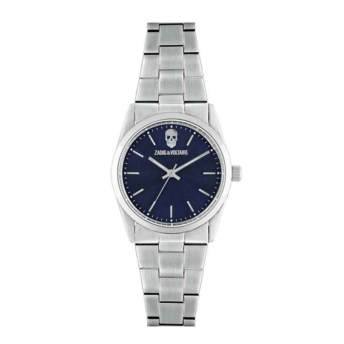 Montre Zadig&Voltaire, en acier inoxydable, coloris silver, cadran noir et motif tête de mort, mouvement quartz, boîte ronde 36 mm, fonctions : heure/minute/seconde, étanche à 5 bar, boîte et bracelet acier.